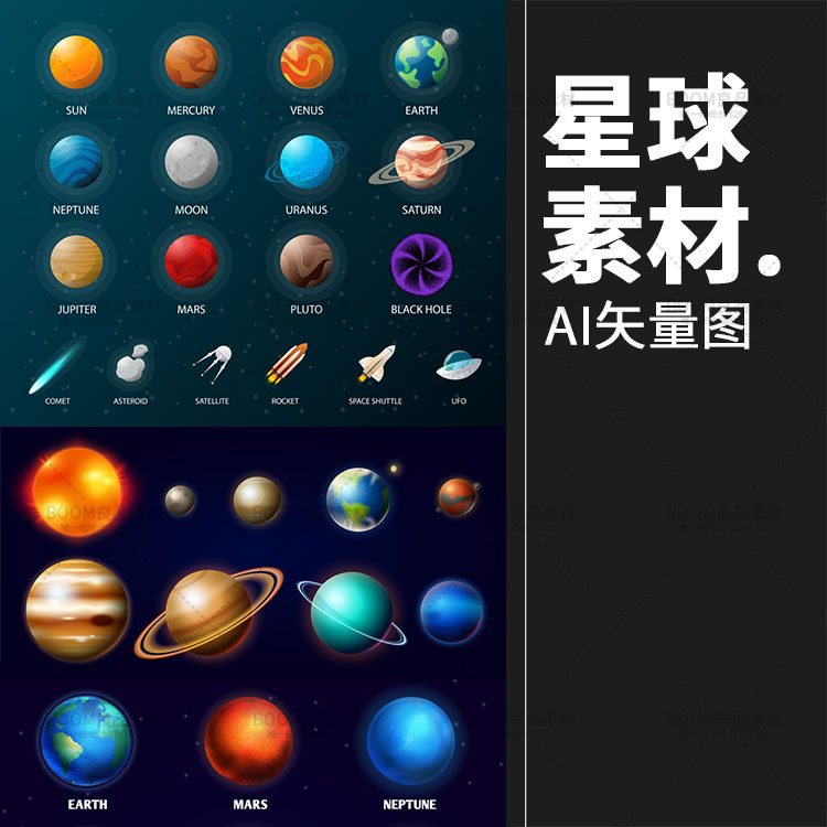 太阳系宇宙恒星行星星球地球火星土星月球冥王星AI矢量插画素材
