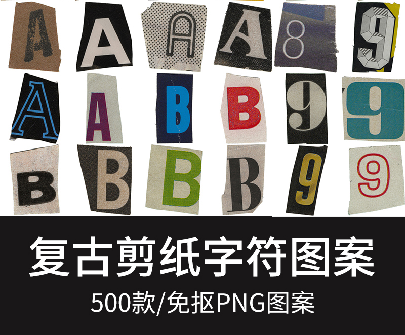 美式复古报纸剪纸字母符号免抠透明背景PNG图案素材